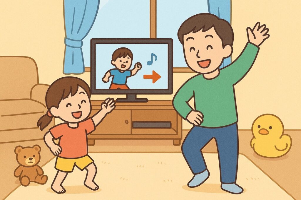 雨の日でも体を動かせる室内遊びの定番。キッズ向けダンス動画やアニメ曲を流して、親子で一緒に踊れば運動不足解消にも。