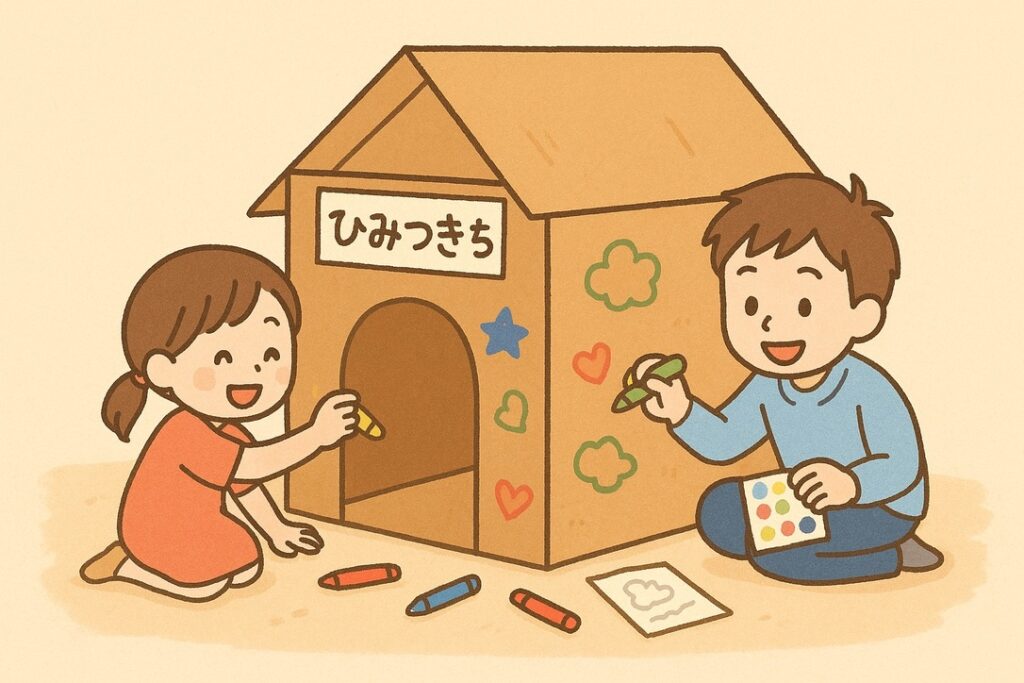 室内でできるクリエイティブな遊び。段ボールを使って秘密基地や乗り物を作り、シールやペンでデコレーションすれば特別な遊び場に。