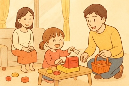 おままごとが好きな娘は、店員さんとお客さんの役を交代しながら、何度も遊んでいます。