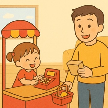 おままごとが好きな娘は、店員さんとお客さんの役を交代しながら、何度も遊んでいます。